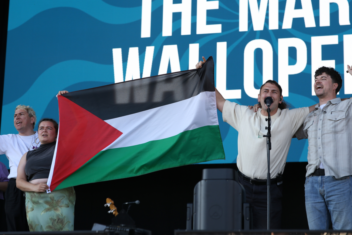 It remains to be seen if the revolution will be televised, but what was captured and shared in a viral fashion was the silencing of the Mary Wallopers for their support of Palestine. Inspiration struck lead singer Andrew Hendy when the sound was cut off the microphones and it was looking as though the band had been successfully silenced, after his brother Charles started speaking some home truths about the shameful behaviour of ‘Victorious’. In Dundalk Eureka fashion, Andrew clocked that his banjo was still plugged-in to the speaker system, and through that the ‘Free Palestine’ chants bellowed.